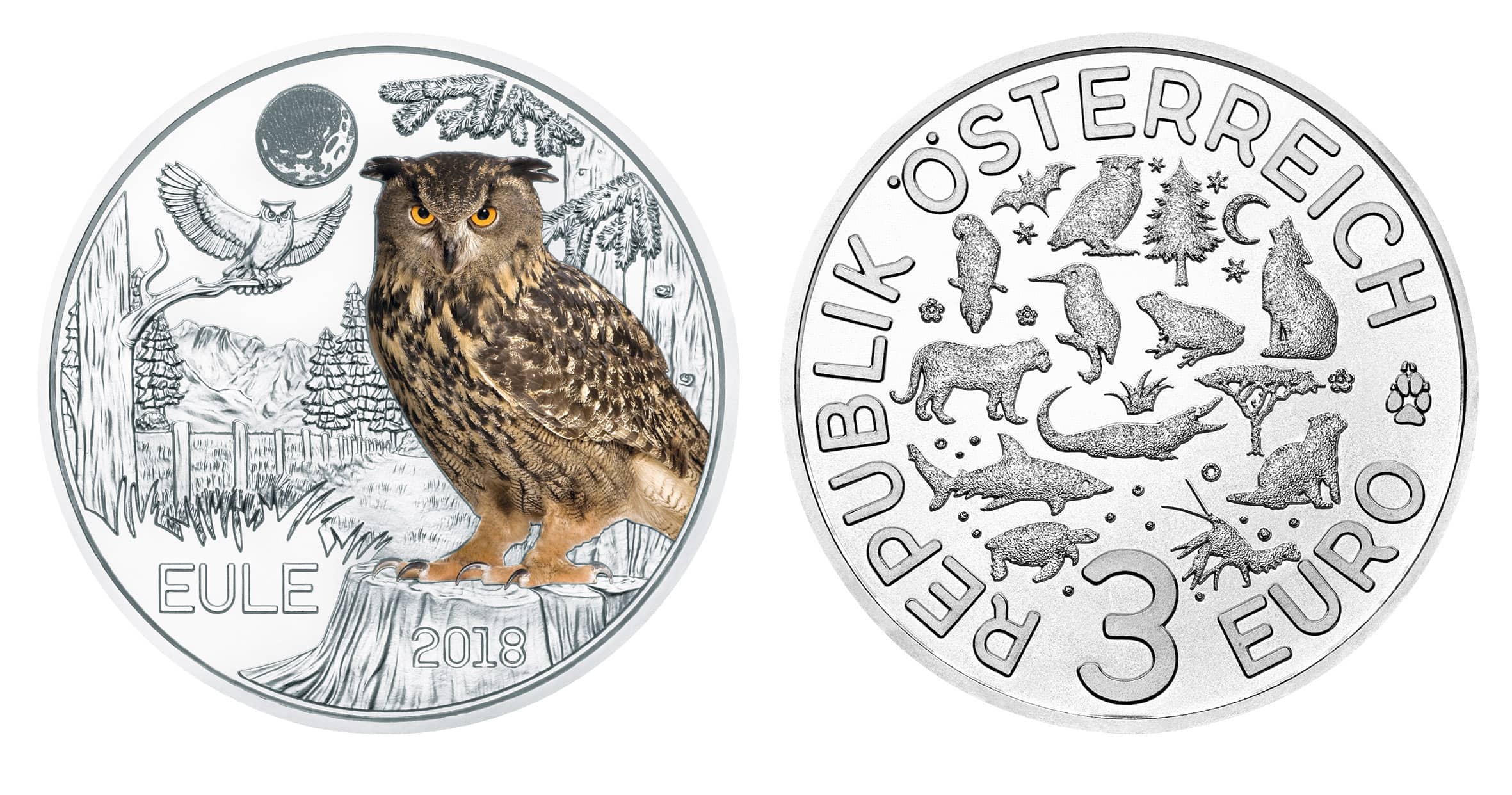 ÖSTERREICH 3 Euro 2018 “Eule”, Cu/Ni, leuchtet im Dunkeln, Auflage 50.000 Stk.