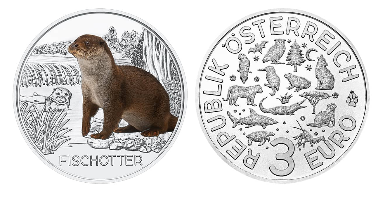 ÖSTERREICH 3 Euro 2019 “Otter”, Cu/Ni, leuchtet im Dunkeln, Auflage 50.000 Stk.
