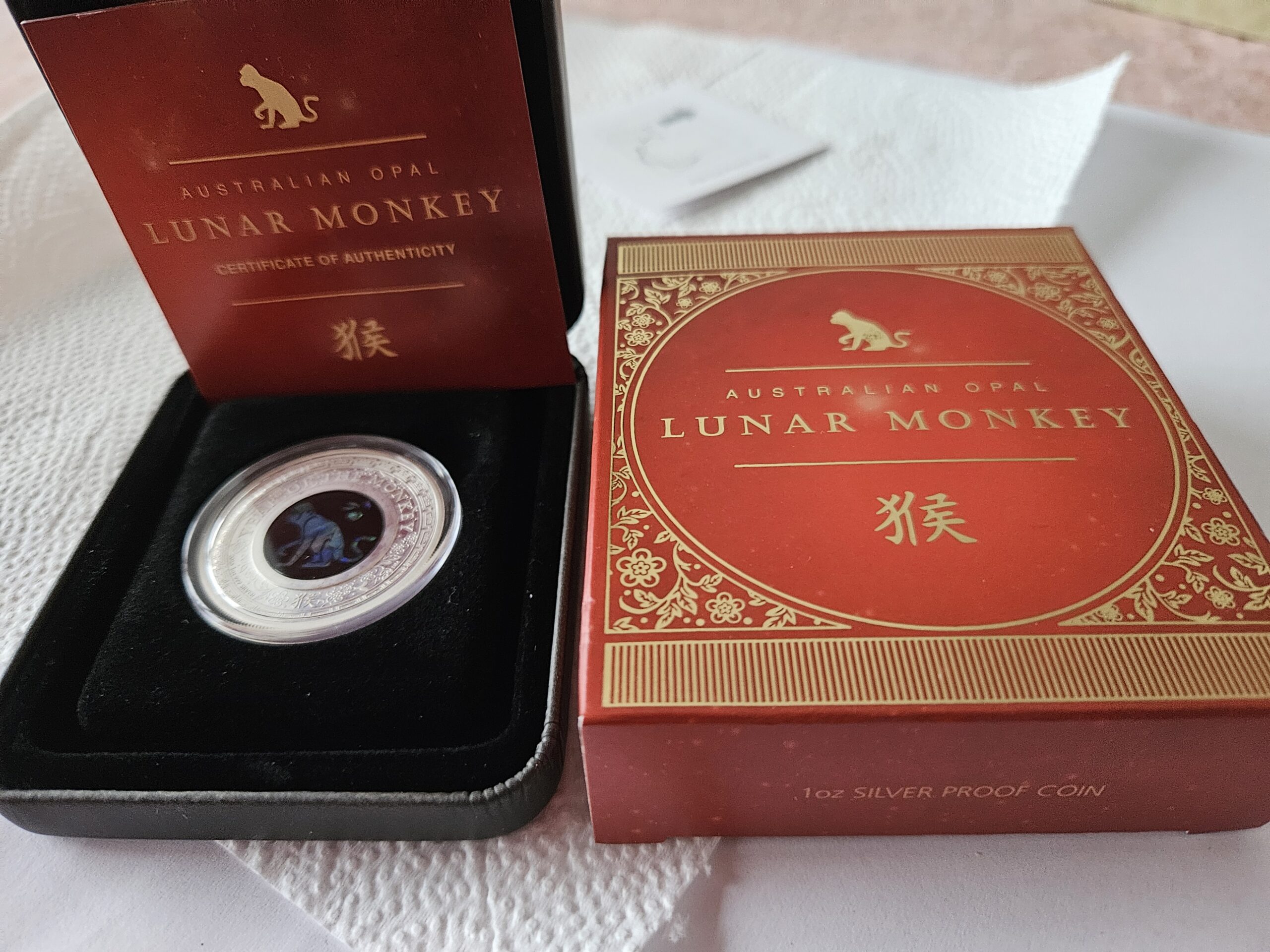 Australien Lunar Monkey – 1 Dollar Silbermünze 2016 Opal, Jahr des Affen, polierte Platte mit Opal inkl. Box, Zertifikat & Umkarton, Auflage 5000 Stück