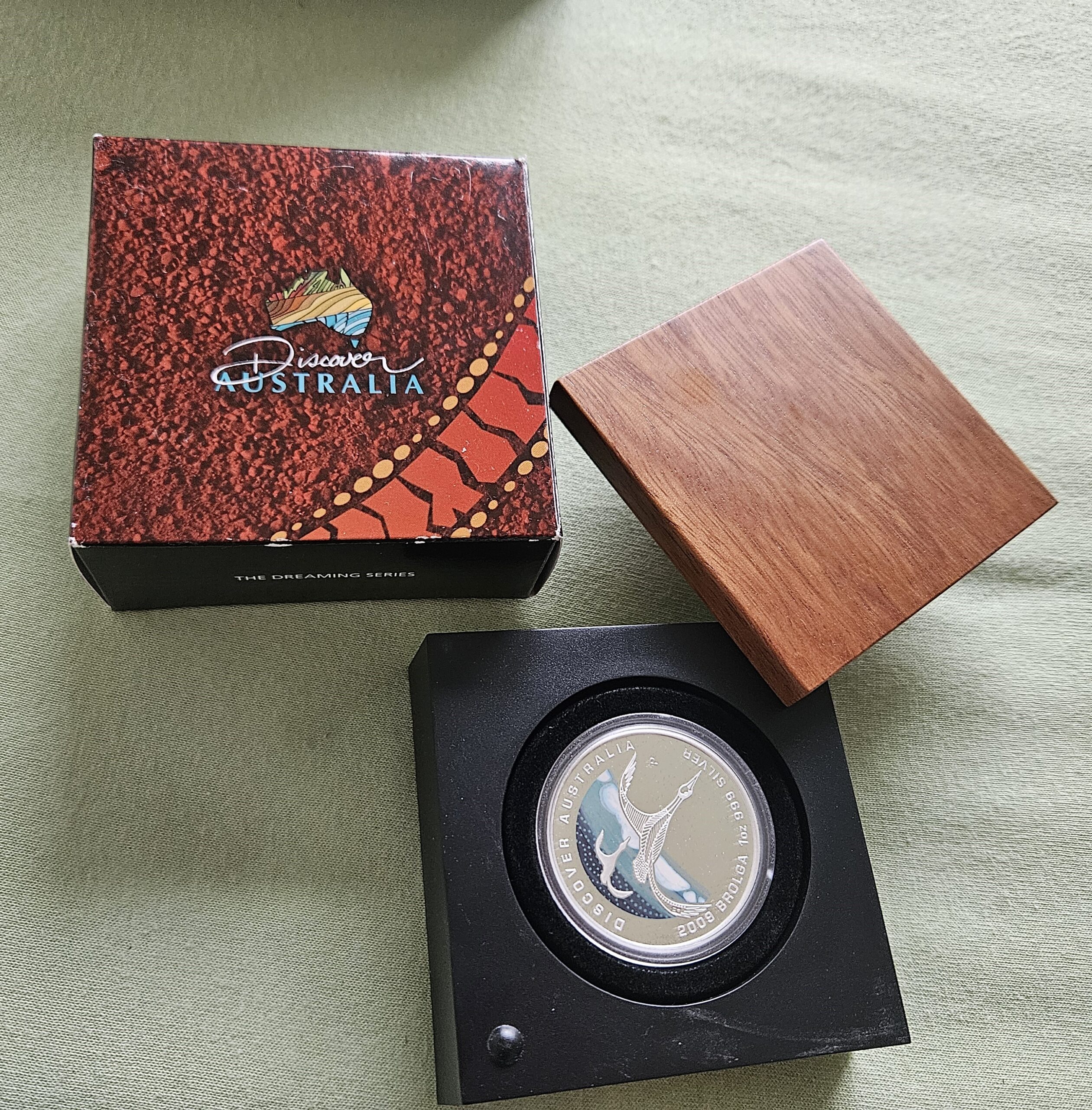 Australien: Perth Mint Prägung, 2009, Motiv Brologa aus der Serie Discover Australia – The Dreaming, 1 Unze 999, 1 Dollar, PP, mit Zertifakat in Schatulle und Überkarton, Auflage 6213 Stück!