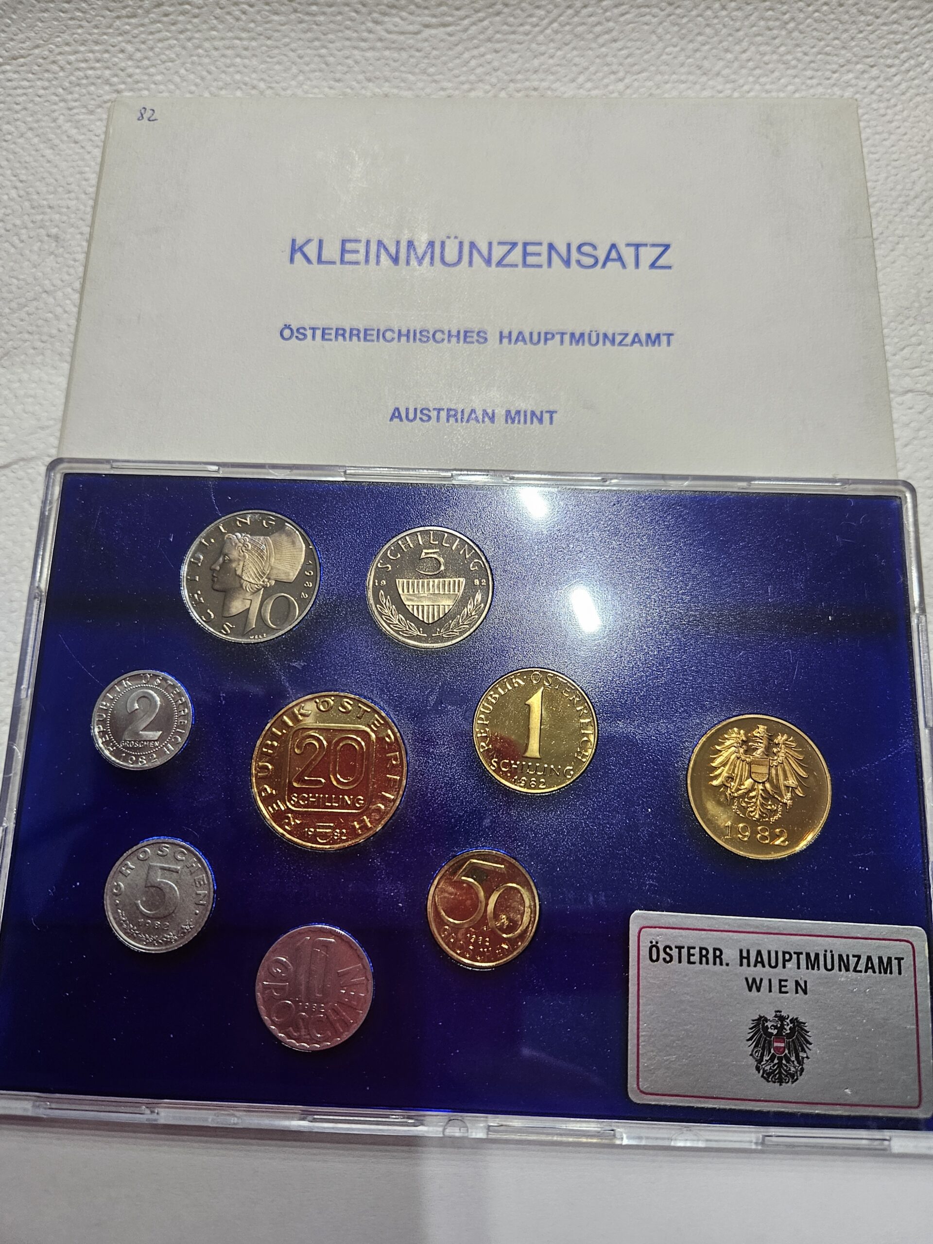 ÖSTERREICH 2. Repbulik KMS Schilling-Münzensatz 1982, PP, Österreichisches Hauptmünzamt, Überkarton mit Gebrauchsspuren