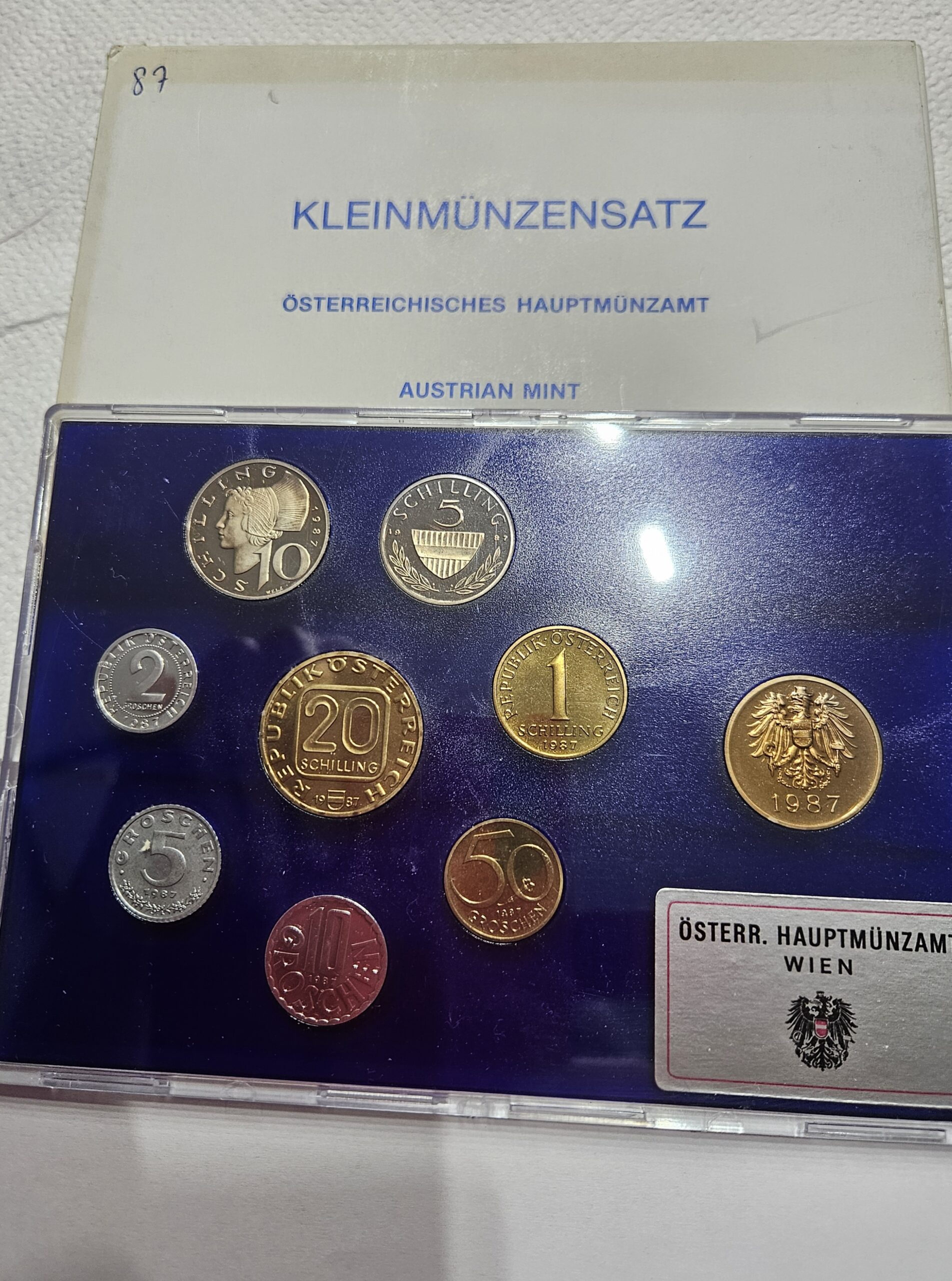 ÖSTERREICH 2. Repbulik KMS Schilling-Münzensatz 1987, PP, Österreichisches Hauptmünzamt, Überkarton mit Gebrauchsspuren