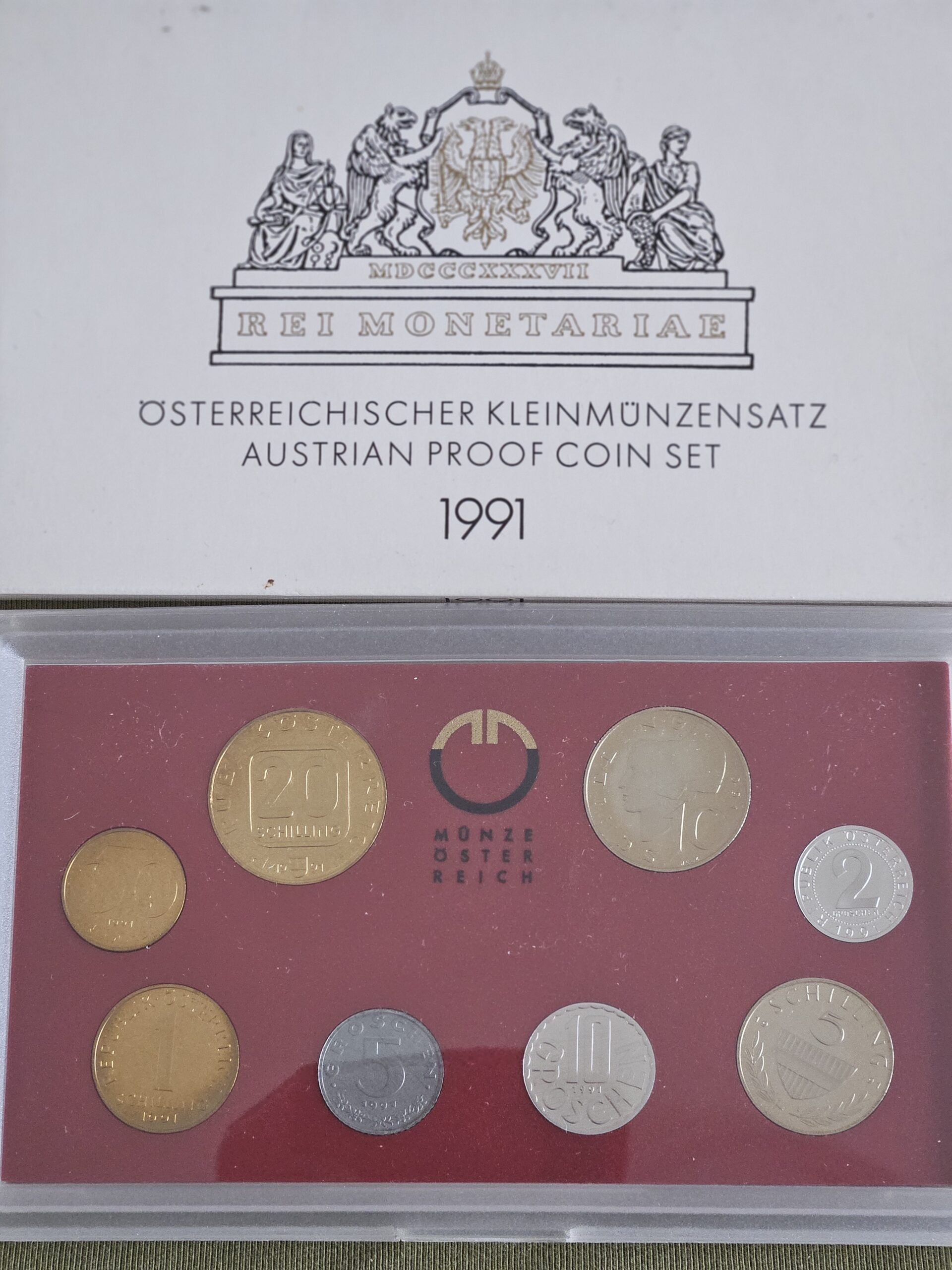 ÖSTERREICH KMS Kleinmünzensatz 1991 PP, alle 7 Münzen und 20 Schilling Burgtheater F. Grillparzer, original der Münze Österreich.